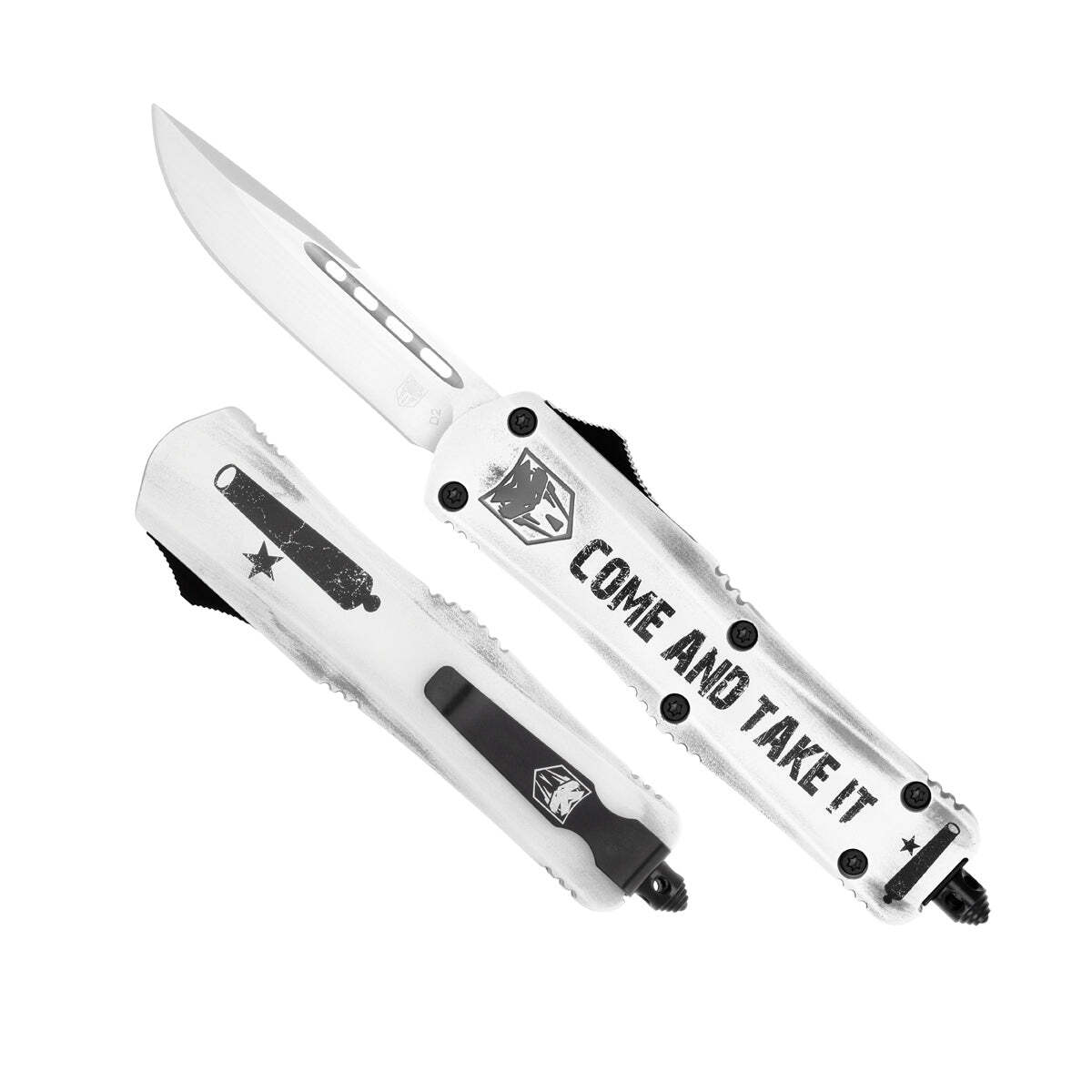 Středně velká verze oblíbeného FS-3 přesvědčí svou robustní čepelí z D2 oceli ve tvaru drop point, která se vysouvá z přední části rukojeti stisknutím tlačítka a opět se zasouvá při dalším stisknutí. Tento OTF (Out The Front) nůž má texturovanou rukojeť z vysoce pevného hliníku s nápisem "Come and take it" a černou hvězdou. Deep carry clip je připevněn k rozbíječi skla a umožňuje nošení hrotem nahoru na obou stranách. Dodává se s vysoce kvalitním nylonovým pouzdrem.