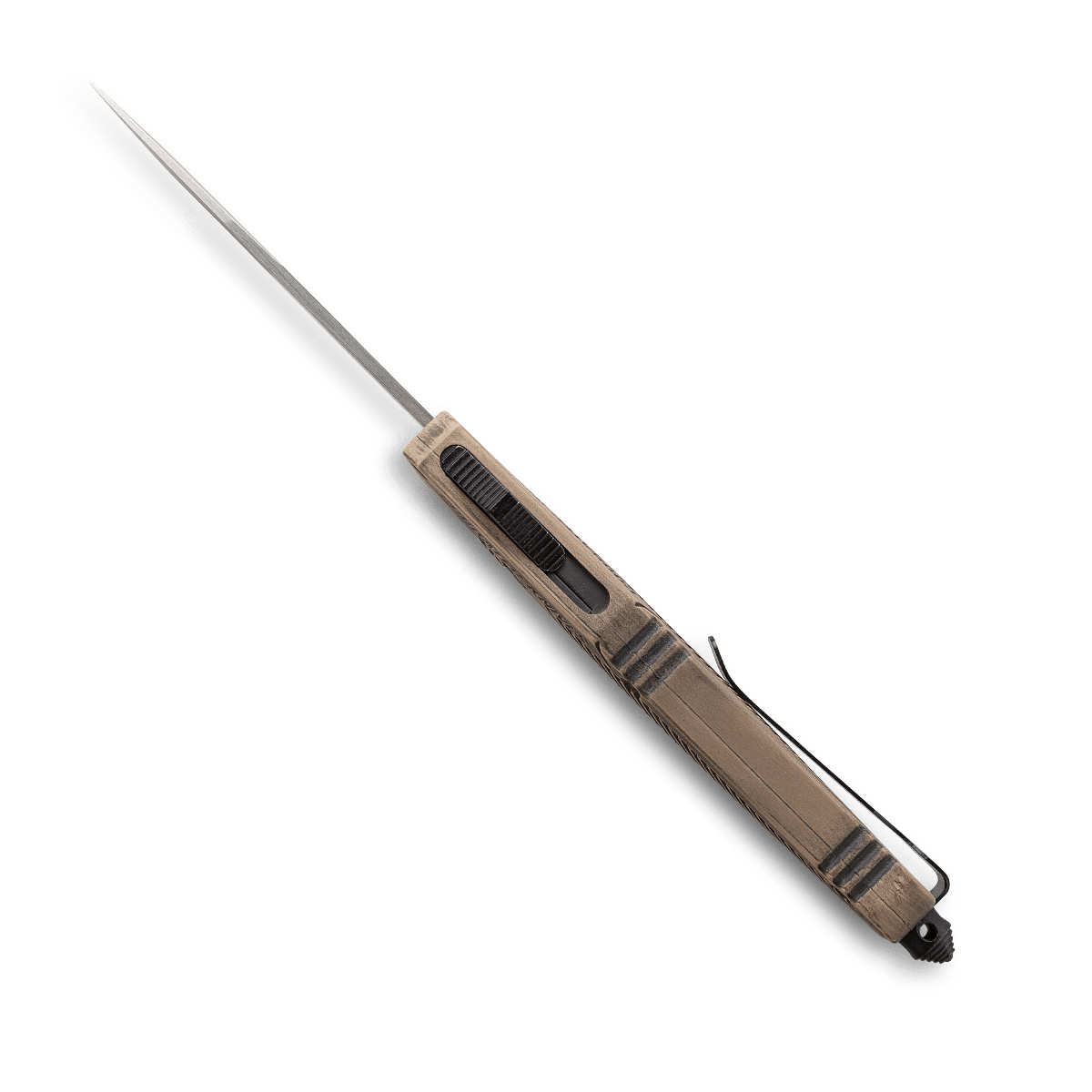 Středně velká verze oblíbeného CTK-1 zaujme pevnou čepelí z D2 oceli ve tvaru drop point, která se po stisknutí tlačítka vysune z přední části rukojeti rychlostí šípu a po dalším stisknutí se opět zasune. Tento OTF (Out The Front) nůž má texturovanou rukojeť z vysoce pevného hliníku s povrchovou úpravou v pískově hnědé barvě. Deep carry clip je připevněn k rozbíječi skla a umožňuje nošení s hrotem nahoru. Dodává se s kvalitním nylonovým pouzdrem.
