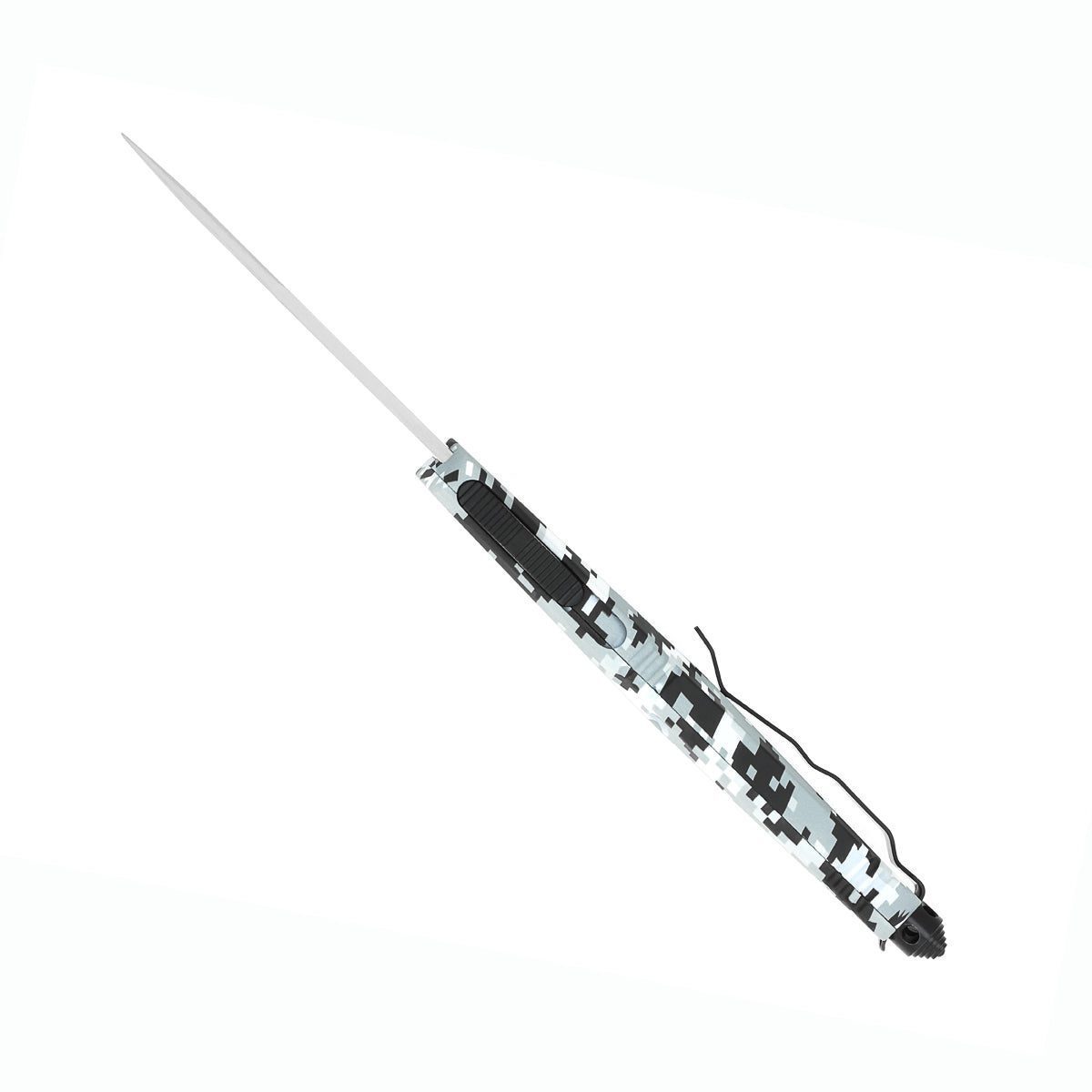 Plně vyvinutá verze oblíbeného FS-3 přesvědčuje svou robustní čepelí z D2 oceli ve tvaru drop point, která se po stisknutí tlačítka vysune z přední části rukojeti rychlostí šípu a po dalším stisknutí se opět zasune. Tento OTF (Out The Front) nůž má texturovanou rukojeť z vysoce pevného hliníku s motivem zimní kamufláže. Deep carry clip je připevněn ke skleněnému rozbíječi a umožňuje nošení hrotem nahoru na obou stranách. Dodává se s vysoce kvalitním nylonovým pouzdrem.