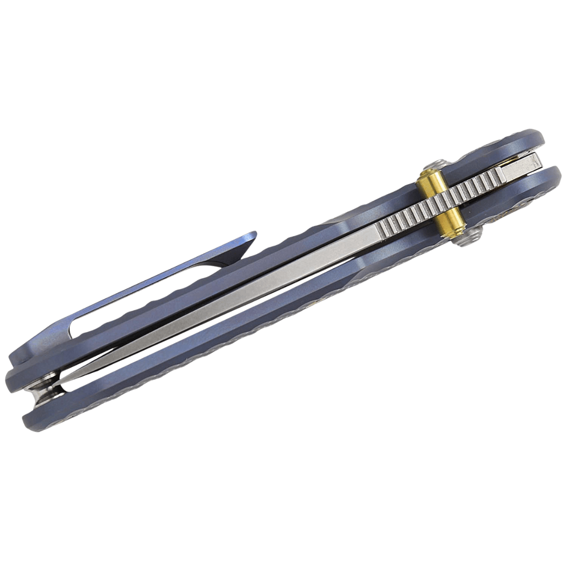 Rukojeť je vyrobena z modrého titanu 6AL4V s texturou včelí plástve pro lepší úchop a odolnost. Kapesní klip je titanový a nastavený pro tip-up nošení na pravé straně.
