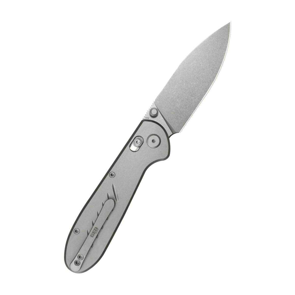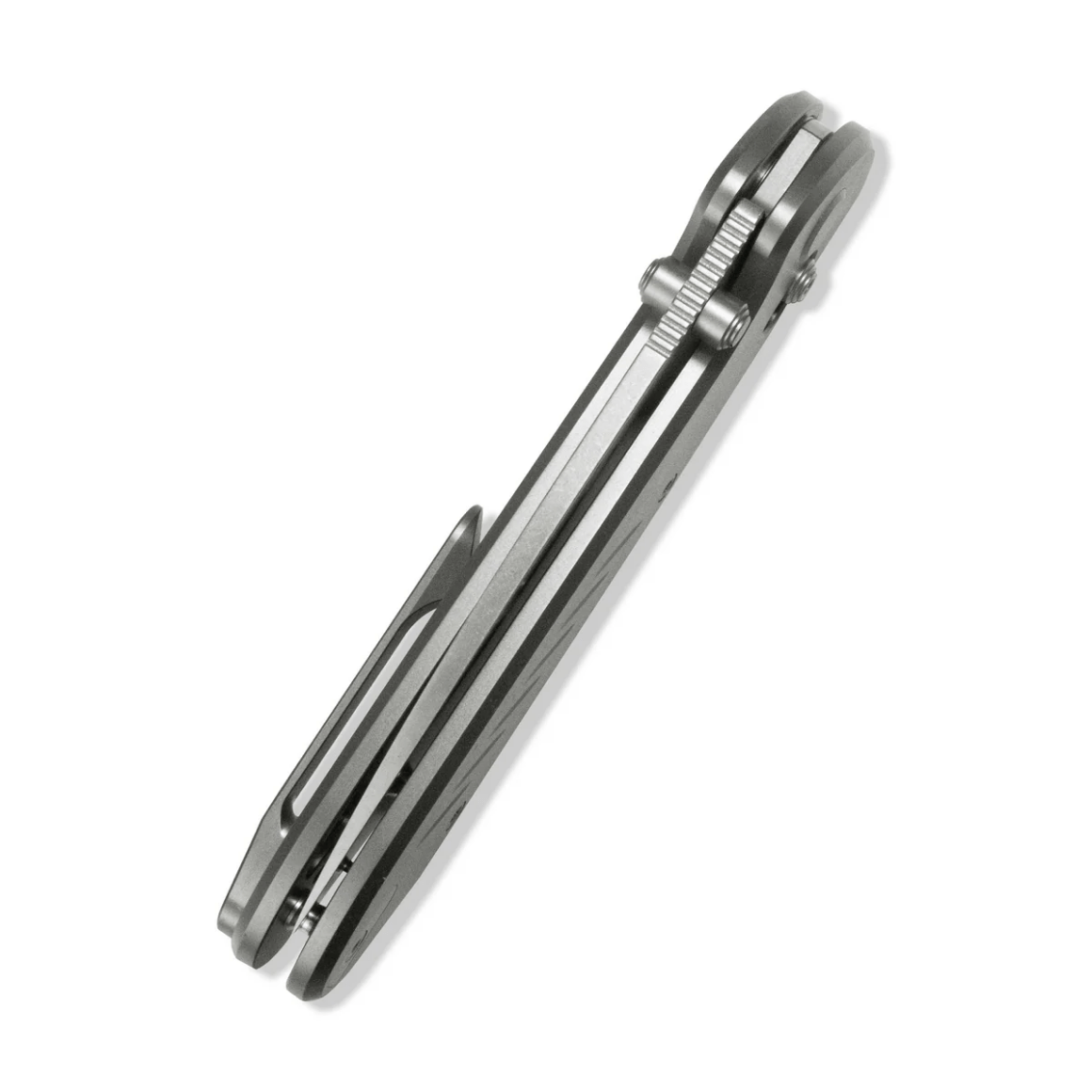 Rukojeť je vyrobena z šedého titanu 6AL4V, s hladkou texturou pro pevný úchop a odolnost. Kapesní klip je titanový a nastavený pro nošení hrotem nahoru na pravé straně.