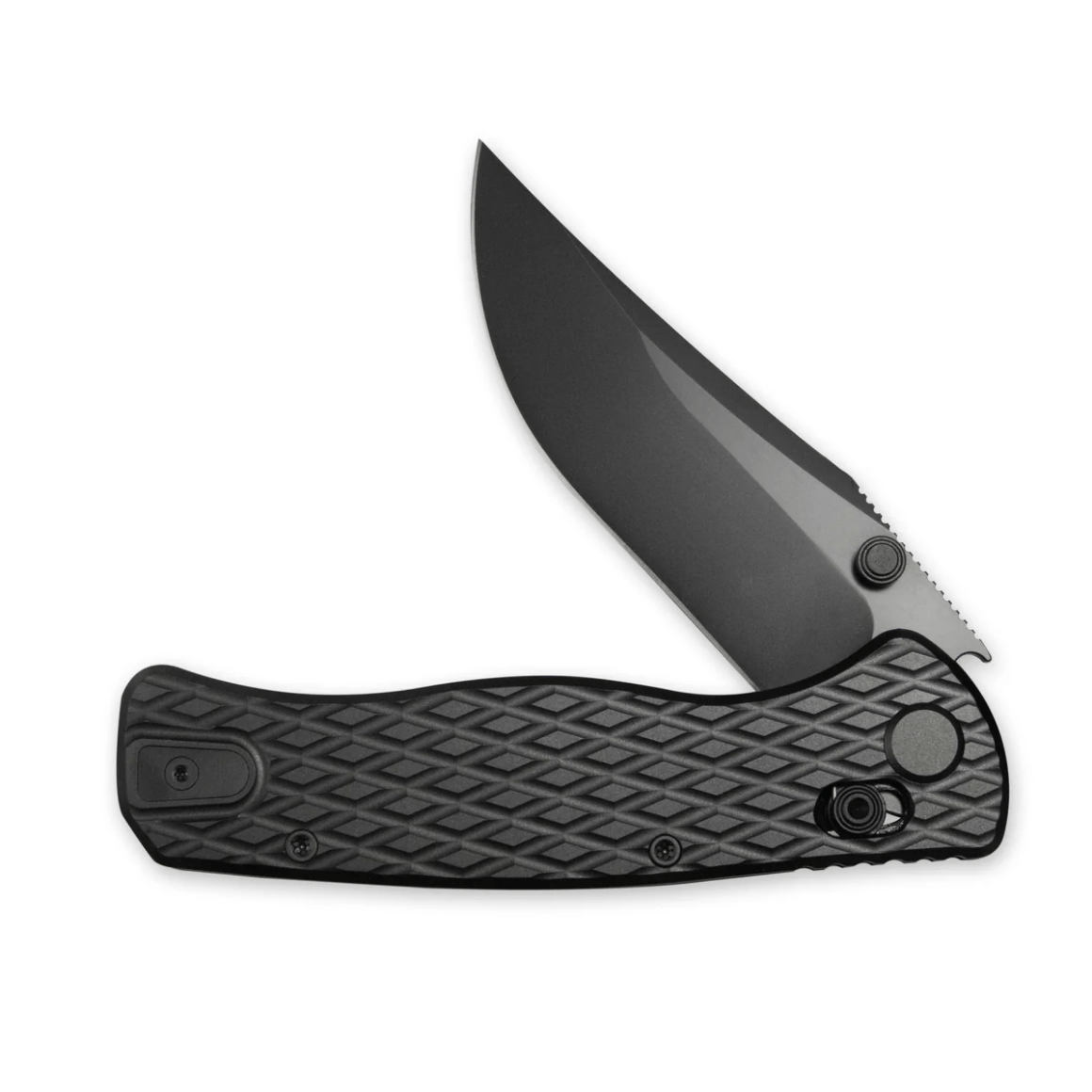 Rukojeť je vyrobena z černého titanu 6AL4V, s texturou pro lepší úchop a odolnost. Kapesní klip je titanový a nastavený pro nošení na pravé straně, hrotem nahoru.