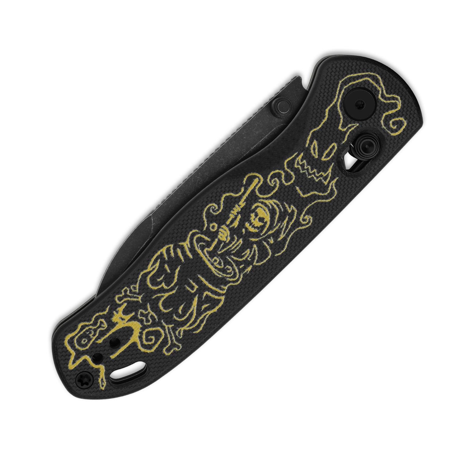 Rukojeť je vyrobena z černého G10 s designem Grim Reaper. G10 je kompozitní materiál zhotovený ze skelných vláken a syntetické pryskyřice. Díky jemné textuře G10 skvěle padne do ruky a nabízí pevný úchop.