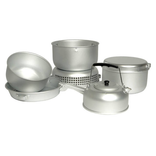 Turistická sada nádobí na vaření sestávající z lihového hořáku s pouzdrem, tří hrnců / misek, dvou talířů / pánve, rychlovarné konvice a držáku na nádobí. Souprava je vyrobena z vysoce kvalitního hliníku s vynikající tepelnou vodivostí, díky čemuž na vaření nevyžaduje velké množství paliva. Design je tak promyšlený, že zabírá málo místa a snadno se přepravuje. Je to praktické řešení pro rodiny s dětmi, kde potřebujete připravit jídlo pro 2-4 osoby. Po zabalení pro přepravu nebo skladování jsou jeho rozměry pouze 23 x 23 x 15 cm. Souprava váží 950 gramů.