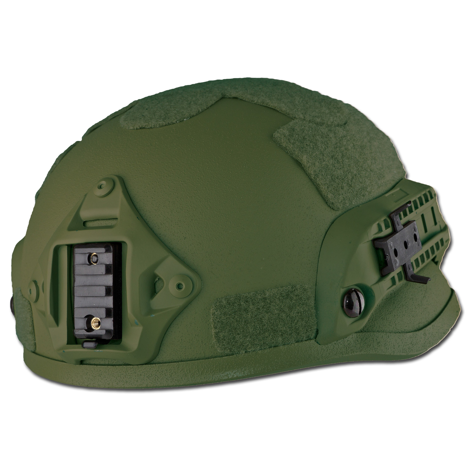 Replika bojové přilby Miltec US MICH 2002 s namontováním zařízení pro noční vidění a bočními kolejničkami. Vnitřek lze přizpůsobit pro pohodlí, přilba má množství povrchů na suchý zip a má odskrutkovateľné boční křídla.