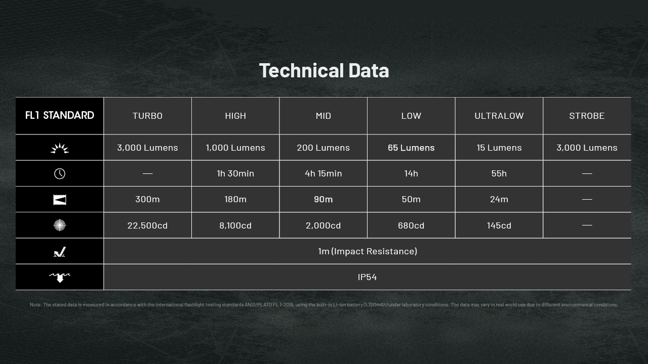 1000 ANSI lumenů (1h30) dosah 180 metrů 8100 cd