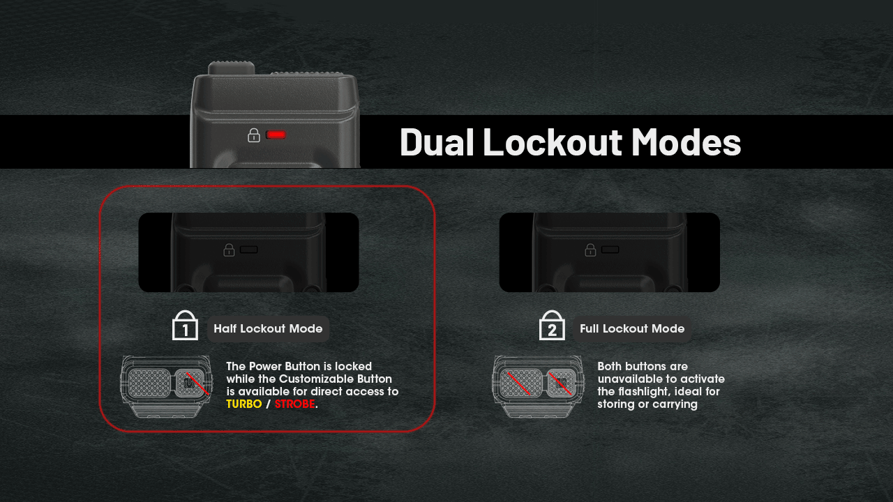 Režimy uzamykání: Dva režimy uzamykání (poloviční a úplný) zabraňují náhodnému spuštění a vybití baterie.