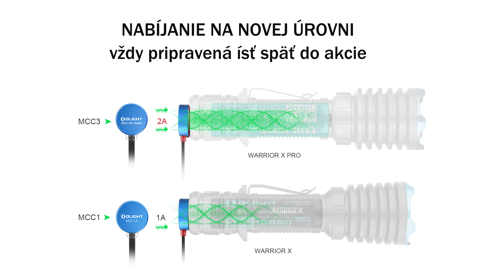 Model Warrior X Pro je napájen z vlastní baterie 21700, kterou je možné nabíjet přímo v baterii pomocí magnetické nabíječky Olight MCC3 2A USB (je součástí balení). Tyto baterie se vyznačují stabilním provozem v širokém rozsahu teplot a nevykazují tendenci k samovybíjení (životnost 10 let), což z nich činí ideální volbu pro vojenské, policejní, záchranné složky. Baterie informuje o nízkém nabití baterie opakovanými vibracemi.