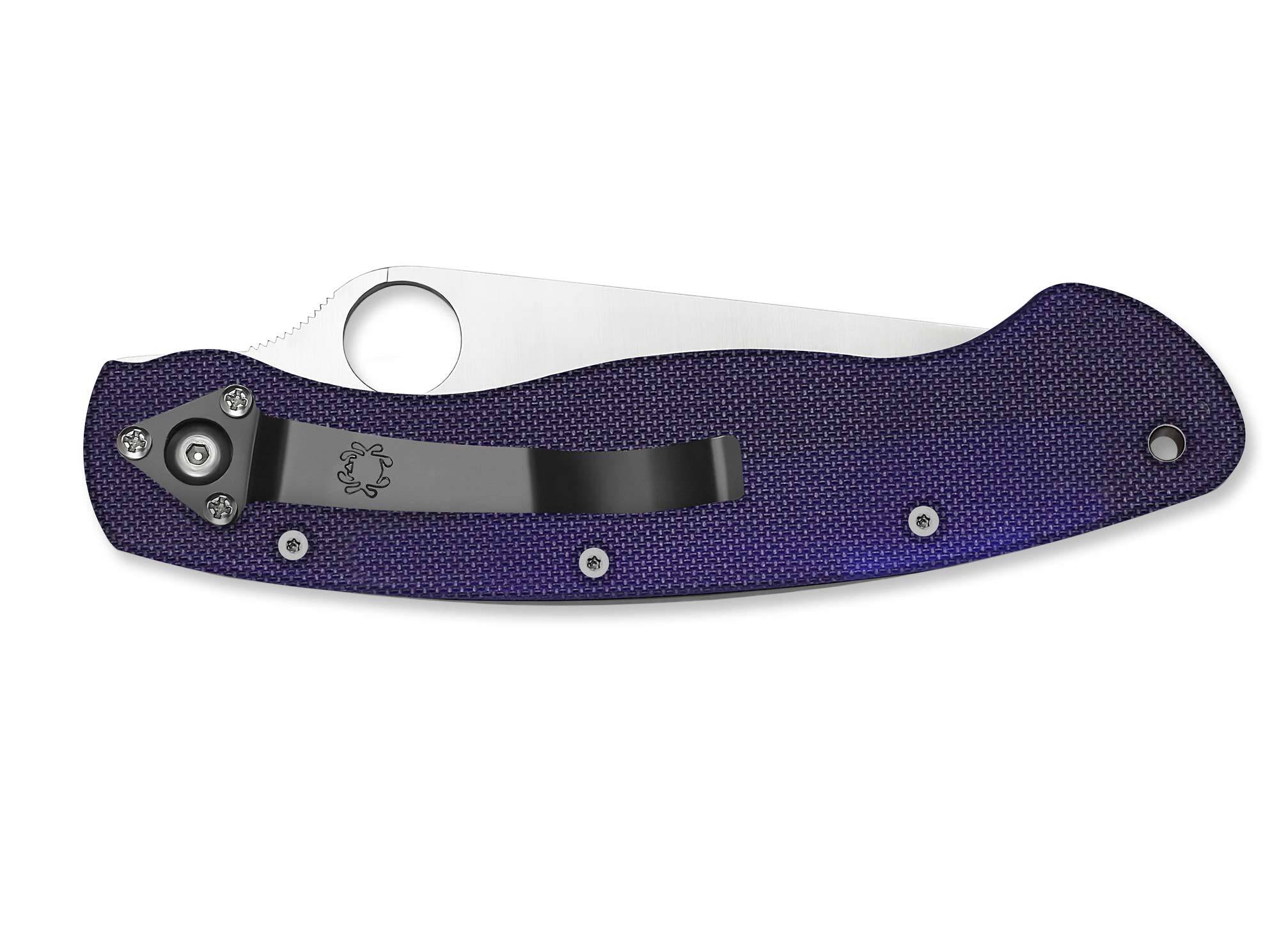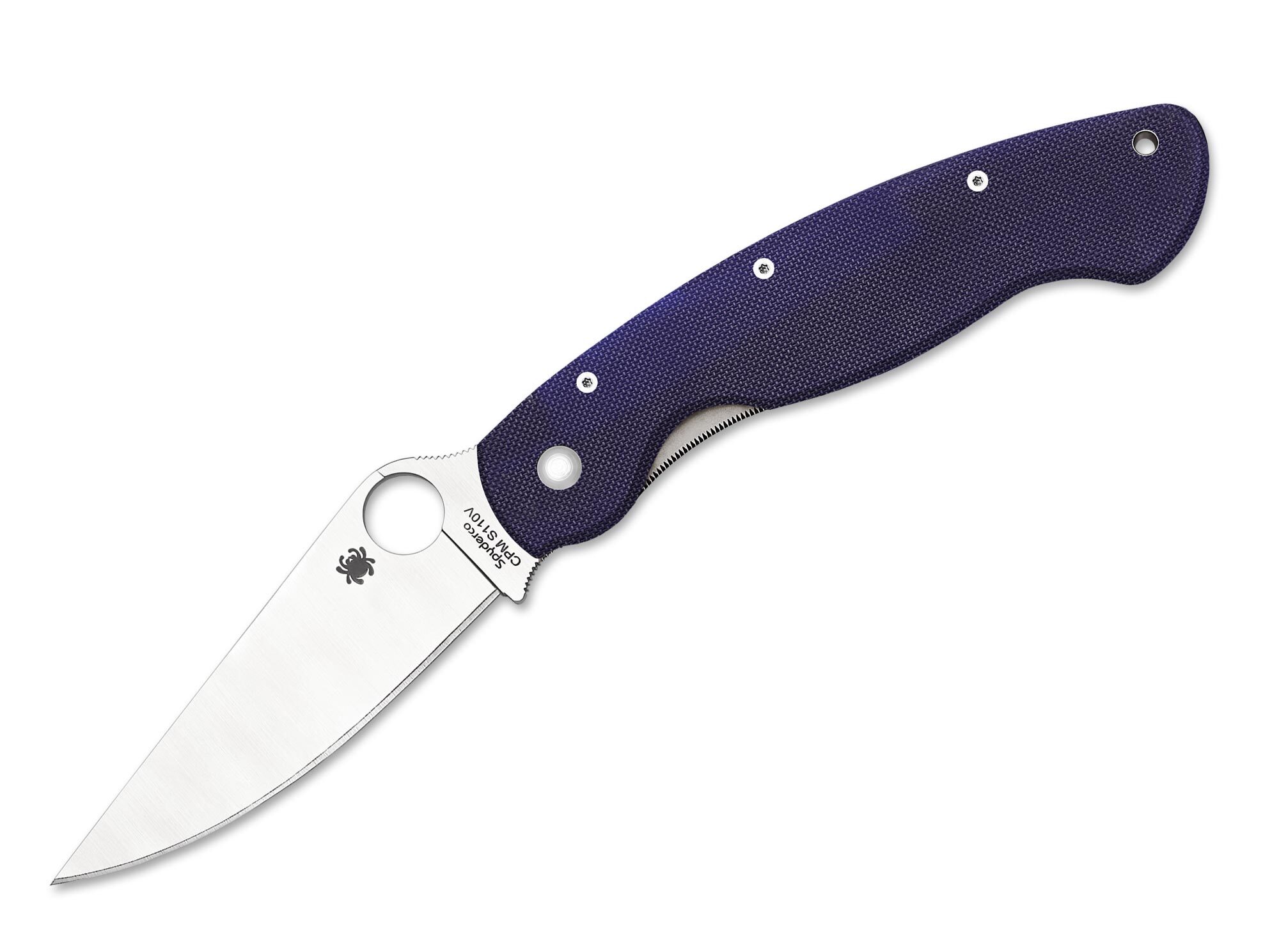 Taktický zavírací nůž Spyderco Military G10 Dark Blue má čepel s hladkou hranou a plochým broušením z nerezavějící oceli CPM-S-110V, otevírá se palcovým otvorem na čepeli a zajišťuje ji zámek Linerlock. Rukojeť je z tmavomodrého neklouzavého G10 s titanovou vložkou. Se sponou na kapsy.