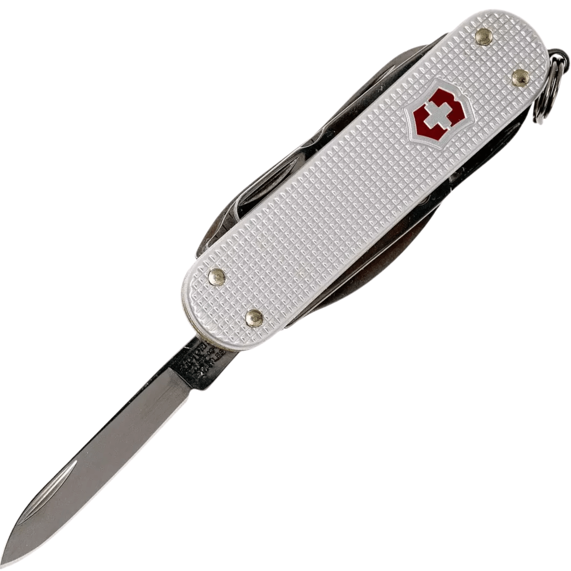Malý kapesní multifunkční nůž Victorinox Minichamp Alox Silver s kvalitními váhami Alox ve stříbrném provedení. Zahrnuje škrabku na pomeranč či nástroj na úpravu nehtové kůže.