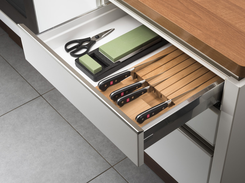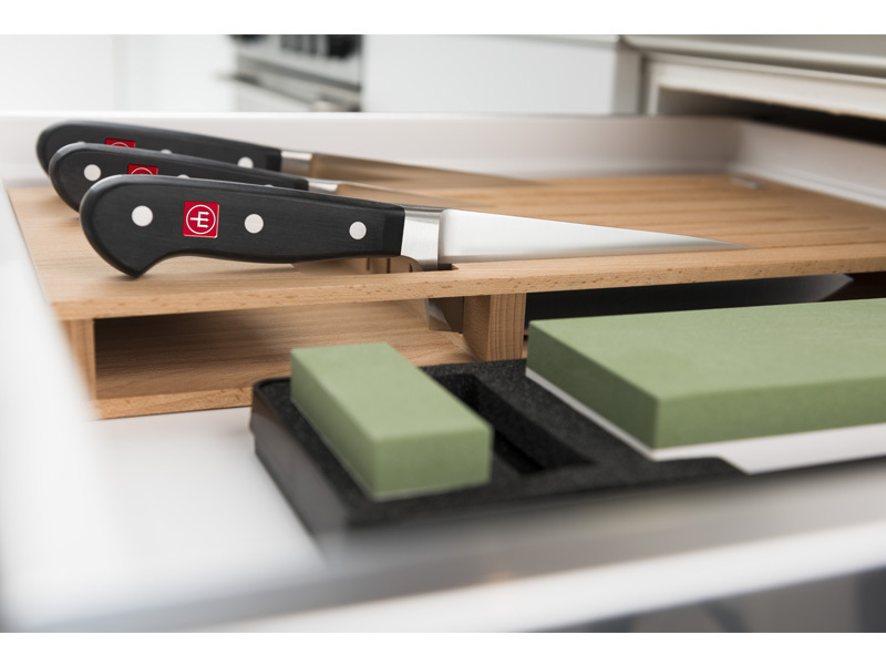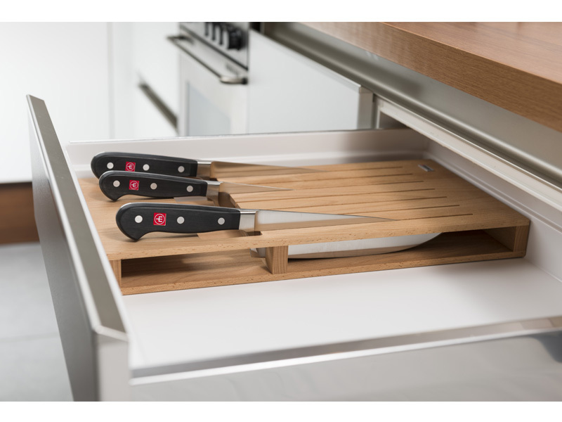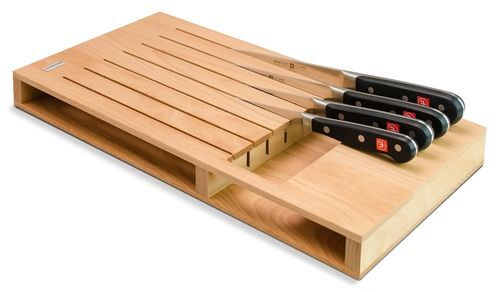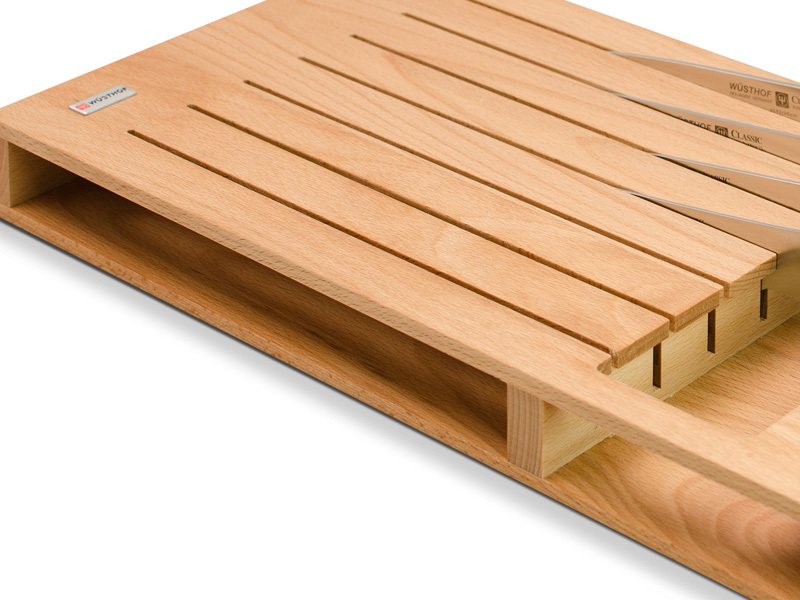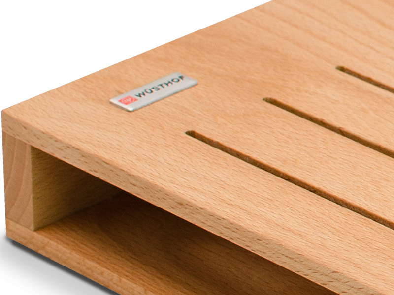 Praktický organizér Wüsthof do zásuvky je vyroben z přírodního bukového dřeva a je vhodný do všech standardních zásuvek a výsuvů. Široká prohlubeň pod rukojeťmi usnadňuje vyjmutí nože a také poskytuje ochranu před ostrými čepelemi. Bezpečný a pohodlný způsob, jak ukládat nože.