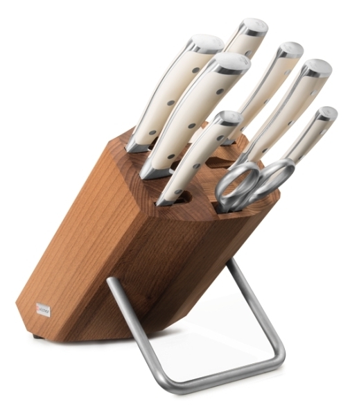 8 dílná sada Wüsthof IKON Royal Creme v praktickém hnědém bloku z termo bukového dřeva. Obsahuje 6 ks kovaných nožů s krémovou syntetickou rukojetí, ocílku kuchyňské nůžky.