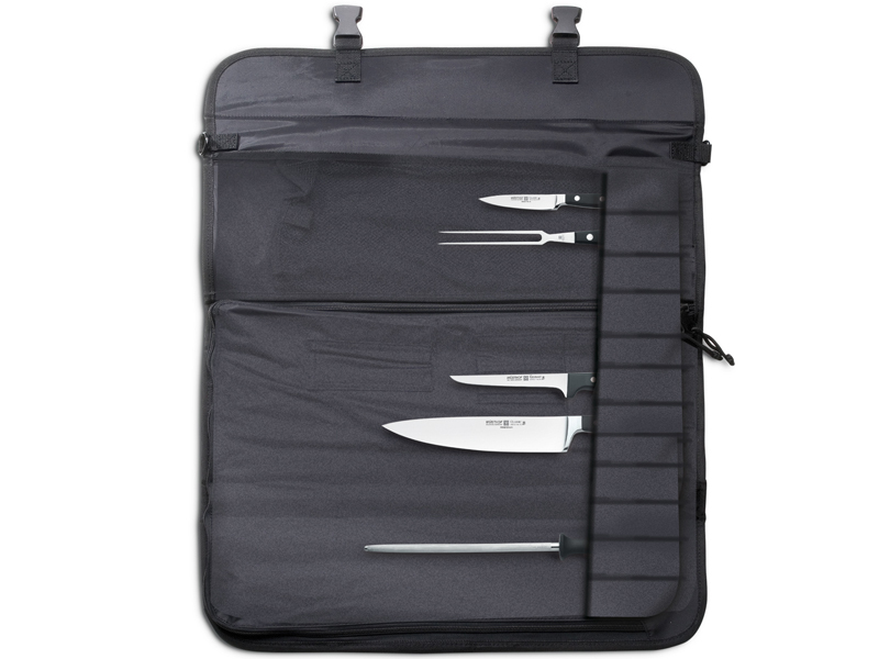 Kuchařská mapa Wüsthof ve stylu měkké zavazadel z odolné, velmi pevné tkaniny - polyesteru v černé barvy. Vhodná pro 10 ks nožů s délkou čepele do 32 cm + příslušenství. Omyvatelná, uzamykatelná na zip, pro upevnění vnitřní vrstvy je opatřena uchem a popruhem. Doporučuje se použít ochranu ostří v tašce.